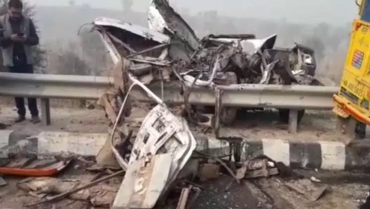 |ഡല്ഹിയേയും ഹരിയാനയേയും ബന്ധിപ്പിക്കുന്ന റോഹ്തക്-റെവാരി ഹൈവേയിലാണ് ഇന്ന് രാവിലെ അപകടമുണ്ടായത്.
