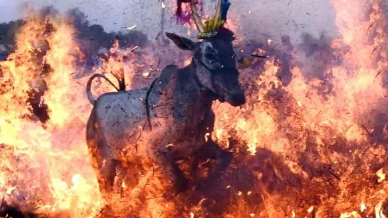 എന്തിനീ ക്രൂരത; ആളിക്കത്തുന്ന തീയിലൂടെ പശുക്കളെ ഓടിക്കുന്ന ആചാരം
