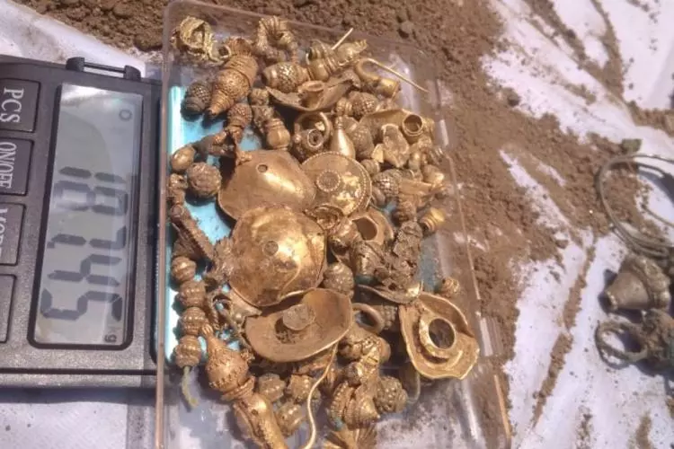 77.220 ഗ്രാം ഭാരമുള്ള 22 സ്വർണ്ണ കമ്മലുകൾ, 57.800 ഗ്രാം ഭാരമുള്ള 51 സ്വർണ്ണ മുത്തുകള്, 17.800 ഗ്രാം ഭാരമുള്ള 11 സ്വർണ്ണ പുസ്തെലു (മംഗല്യസൂത്ര) എന്നിവയാണ് ആഭരണങ്ങളുടെ കൂട്ടത്തിലുള്ളത്. 1.227 കിലോഗ്രാം ഭാരമുള്ള 26 വെള്ളി വടികളും 216 ഗ്രാം ഭാരമുള്ള 5 വെള്ളി മാലകളും 42 ഗ്രാം ഭാരമുള്ള മറ്റ് വസ്തുക്കളുമാണ് കുടത്തിലുണ്ടായിരുന്നത്.