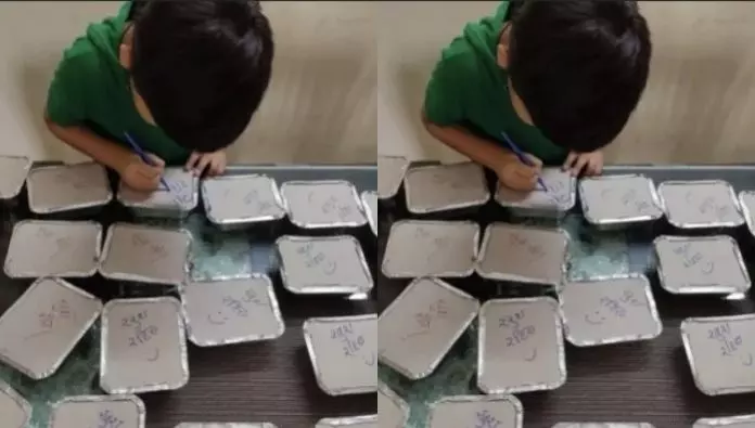 കോവിഡ് രോഗികള്ക്കായി അമ്മ തയ്യാറാക്കിയ ഭക്ഷണപ്പൊതിയില് 'ഖുഷ് രഹിയേ' സന്തോഷമായിരിക്കൂ എന്നാണ് അവന് കുറിക്കുന്നത്. ഓരോ പൊതിയിലും പേന കൊണ്ട് എഴുതുകയാണ് ഈ മിടുക്കന്. ''ഈ കുട്ടിയുടെ അമ്മ കോവിഡ് രോഗികള്ക്കായി ഭക്ഷണം പാകം ചെയ്യുന്നു, ഓരോ ബോക്സിലും ഈ കൊച്ചുകുട്ടി സന്തോഷമായിരിക്കാന് എഴുതുന്നു''. .. എന്ന അടിക്കുറിപ്പോടെ മനീഷ് സാരംഗല് എന്നയാളാണ് ചിത്രം പങ്കുവച്ചിരിക്കുന്നത്. പച്ച നിറത്തിലുള്ള ടീ ഷര്ട്ട് ധരിച്ച കുട്ടി മീല്സ് ബോക്സില് പേന കൊണ്ട് എഴുതുകയാണ്.
