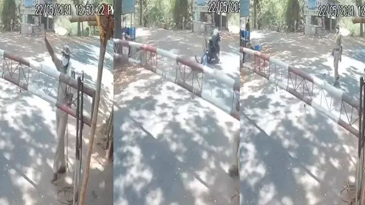 തെലങ്കാനയിലെ തലപൂര് ജില്ലയിലെ ജന്നാരം മണ്ഡല് പ്രദേശത്താണ് സംഭവം. വേഗത്തിലെത്തിയ ബൈക്കിന്റെ പിന്നിൽ ഇരുന്ന യുവാവാണ് ക്രോസ്ബാറിൽ തലയിടിച്ച് തെറിച്ചുവീണത്.