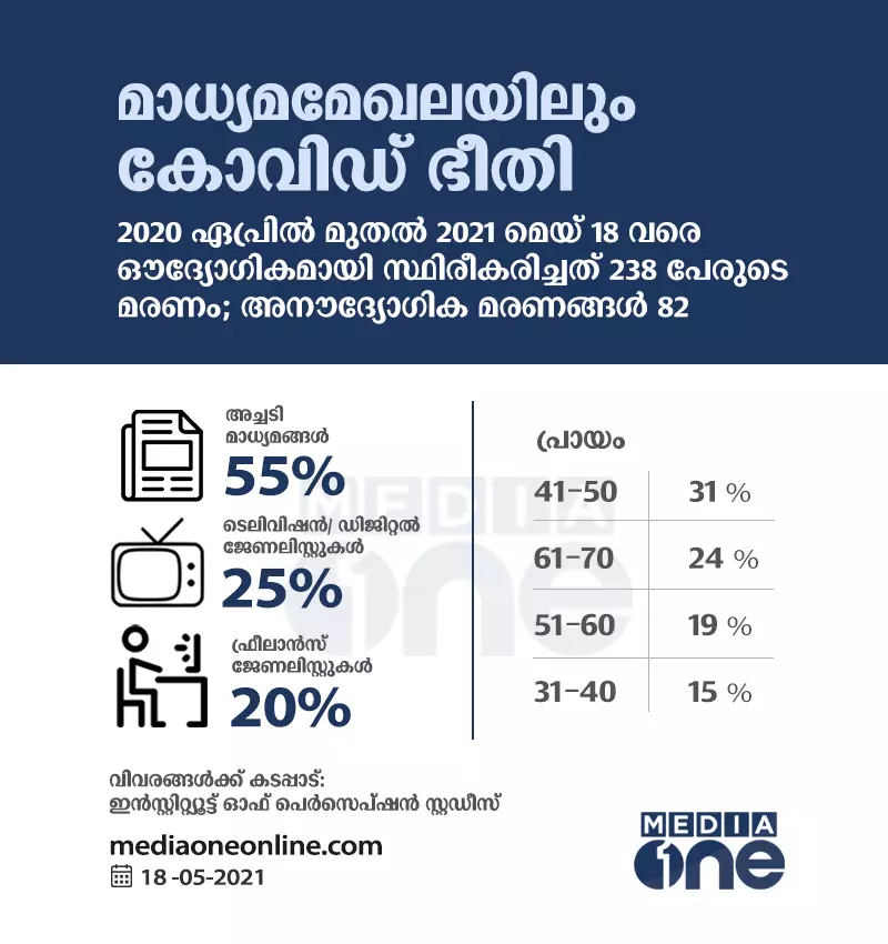ഡൽഹി ആസ്ഥാനമായി പ്രവർത്തിക്കുന്ന ഇൻസ്റ്റിറ്റ്യൂട്ട് ഓഫ് പെർസെപ്ഷൻ സ്റ്റഡീസ് ആണു മാധ്യമമേഖലയിലെ കോവിഡ് പ്രതിസന്ധിയെക്കുറിച്ച് ഞെട്ടിപ്പിക്കുന്ന കണക്ക് പുറത്തുവിട്ടത്. കഴിഞ്ഞ വർഷം ഏപ്രിൽ മുതൽ ഈ മാസം 16 വരെ 238 മാധ്യമപ്രവർത്തകരാണ് കോവിഡ് ബാധിച്ചു മരിച്ചതെന്ന് ഇവരുടെ പഠനത്തിൽ പറയുന്നു. ഇത് ഔദ്യോഗികമായി സ്ഥിരീകരിച്ച കണക്കുമാത്രമാണ്. അനൗദ്യോഗിക കണക്കുകൾ ഇതിനും എത്രയോ മുകളിലാകും. പഠനം സൂചിപ്പിക്കുന്ന പ്രകാരം കഴിഞ്ഞ മാസം പ്രതിദിനം മൂന്നു മാധ്യമപ്രവർത്തകരാണ് കോവിഡ് ബാധിച്ച് രാജ്യത്ത് മരിച്ചത്. മെയ് ആയപ്പോഴേക്കും മരണനിരക്ക് പ്രതിദിനം നാലായിരിക്കുന്നു.