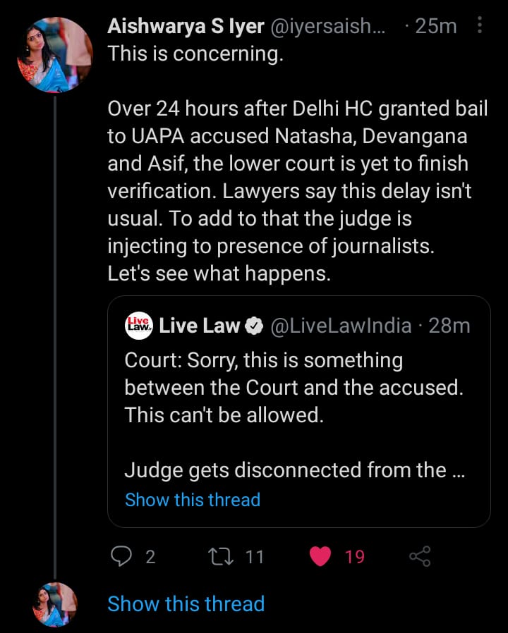 മൂന്നു പേരുടേയും കുറ്റപത്രങ്ങൾ വെവ്വേറെയാണ് കോടതി പരിഗണിച്ചിരുന്നത്. വിമത ശബ്ദങ്ങൾ അടിച്ചമർത്താനുള്ള വ്യഗ്രതക്കിടയിൽ പ്രതിഷേധിക്കാനുള്ള ഭരണഘടനപരമായ അവകാശവും തീവ്രവാദ പ്രവർത്തനവും തമ്മിലുള്ള അതിർവരമ്പ് മാഞ്ഞുപോകുന്നതായി നതാഷയുടെ ജാമ്യ ഉത്തരവിൽ കോടതി ചൂണ്ടിക്കാട്ടി. ഈ മനോഗതി തുടർന്നാൽ ജനാധിപത്യം അപകടപ്പെടുമെന്ന് കോടതി ഓർമിപ്പിച്ചു.