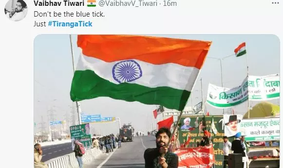 ബ്ലൂ ടിക്കിനെ ഇന്ത്യക്കാർക്ക് ആവശ്യമില്ലെന്നും നമുക്ക് മൂവർണക്കൊടിയുടെ ടിക്കുണ്ടെന്നുമാണ് സംഘ്പരിവാറിന്റെ കാംപയിൻ. ഇതിന്റെ ഭാഗമായി ബ്ലൂ ടിക്കിനു ബദലായി പ്രൊഫൈലിൽ ദേശീയപതാക ചേർത്താണ് ഇവർ പ്രതിഷേധിക്കുന്നത്. ബ്ലൂ ടിക്കിനു പകരം തിരംഗ ടിക്ക് കൊണ്ടുവരണമെന്നാണ് ദേശീയവാദികൾക്ക് ട്വിറ്റർ ഇന്ത്യയോട് ആവശ്യപ്പെടാനുള്ളതെന്ന് ട്വീറ്റിൽ ആവശ്യപ്പെടുന്നു.