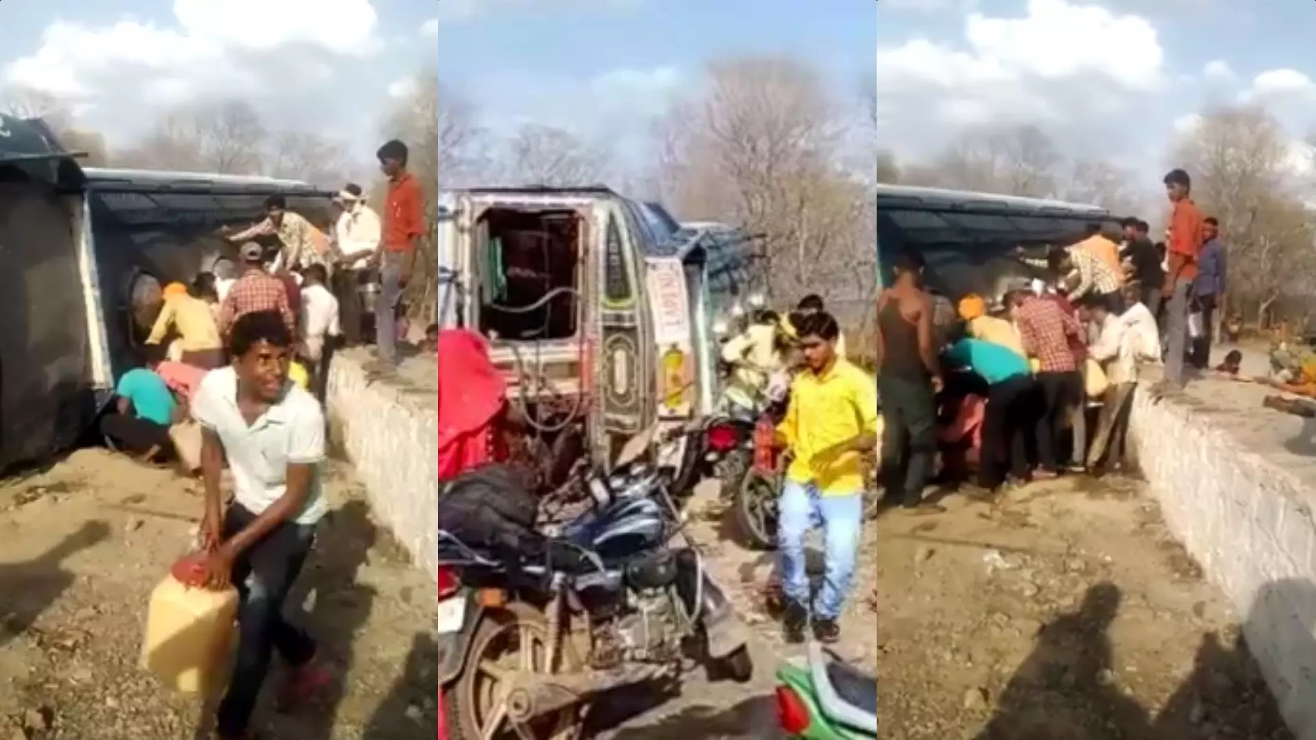 ഇന്ധന ടാങ്കര് മറിഞ്ഞ് അപകടം; പെട്രോള് ഊറ്റി നാട്ടുകാര്, ഡ്രൈവറെ രക്ഷിക്കാന് മറന്നു- വീഡിയോ