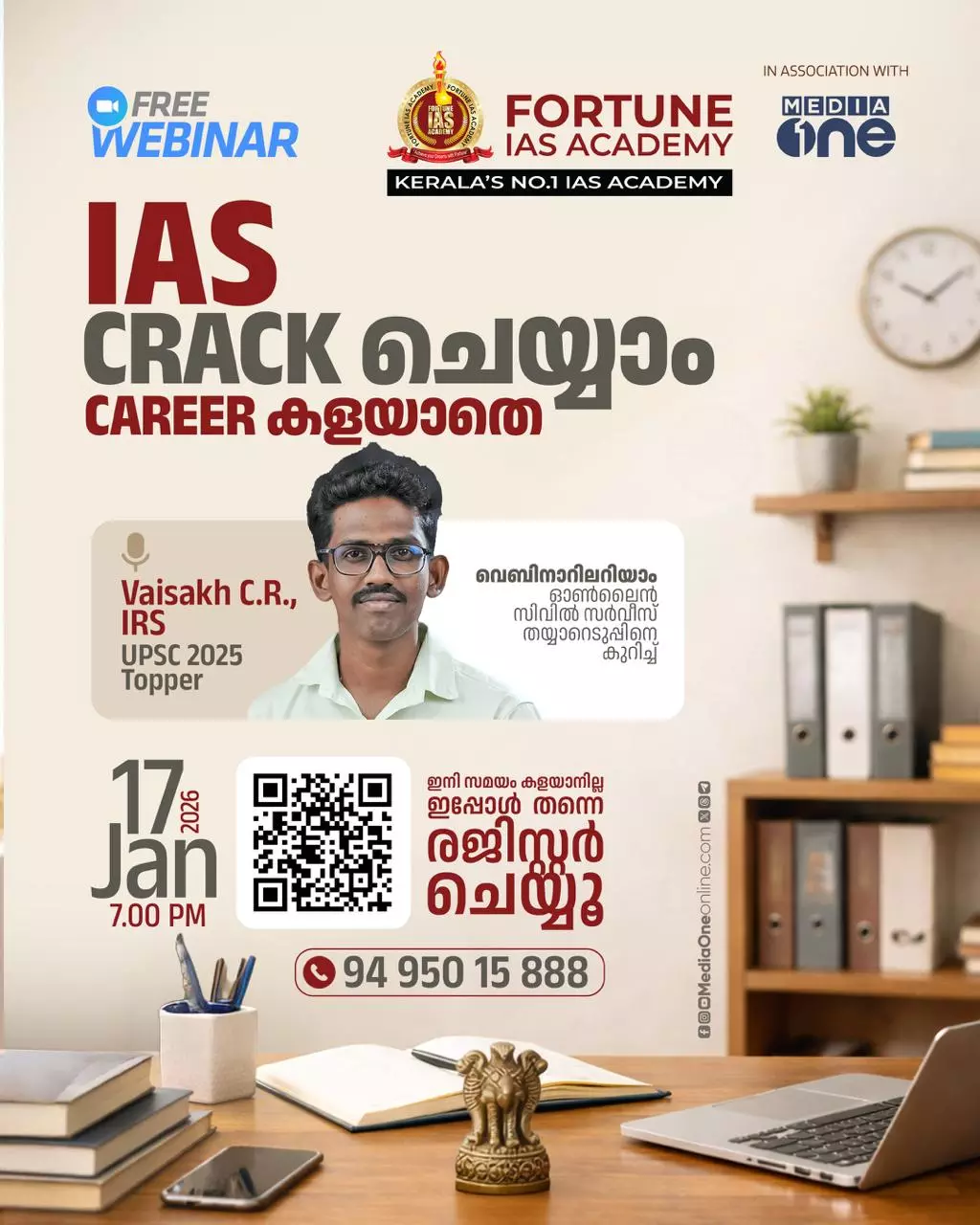 ഓണ്ലൈന് പാഠ്യപദ്ധതിയെ കുറിച്ചും അടുത്ത തവണത്തേക്കുള്ള സിവിൽ സർവീസ് പരിശീലനത്തിനെ കുറിച്ചും നേരിട്ടറിയാനായി ഫോർച്യൂൺ ഐഎഎസ് അക്കാദമി മീഡിയവണുമായി ചേര്ന്ന് ജനുവരി 17-ന്, ശനിയാഴ്ച രാത്രി ഏഴുമണിക്ക് പ്രത്യേക വെബിനാർ സംഘടിപ്പിക്കുന്നുണ്ട്. യു.പി.എസ്.സി. 2025 ടോപ്പർ സി.ആർ. വൈശാഖ് (ഐ.ആർ.എസ്), ഫോർച്യൂൺ അക്കാദമി സീനിയർ ഫാക്കൽറ്റി അരുൺ സുരേന്ദ്രബാബു എന്നിവർ വെബിനാറിൽ സംസാരിക്കും.