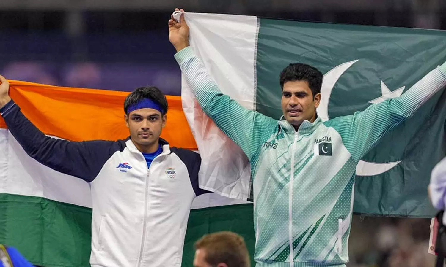 നീരജ് ചോപ്രയും അര്ഷദ് നദീമും പാരിസില് മെഡല്നേട്ടത്തിനുശേഷം