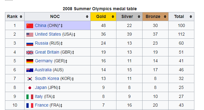 ബെയ്ജിങ് ഒളിമ്പിക്സ് (2008) മെഡല് പട്ടിക