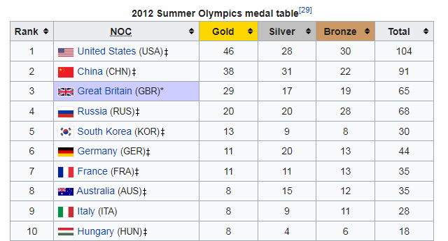 ലണ്ടന് ഒളിമ്പിക്സ് (2012) മെഡല് പട്ടിക