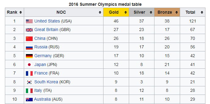 റിയോ ഒളിമ്പിക്സ് (2016) മെഡല് പട്ടിക