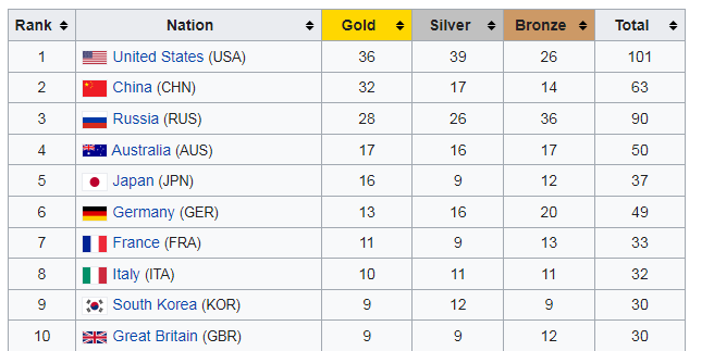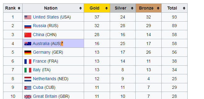 2000ത്തില് ആസ്ട്രേലിയയിലെ സിഡ്നിയില് വെച്ചു നടന്ന ഒളിമ്പിക്സില് യു.എസ് 37 സ്വര്ണം വാരിക്കൂട്ടിയാണ് ഒന്നാമതെത്തിയത്. 32 സ്വര്ണങ്ങളുമായി റഷ്യ രണ്ടാമതും 28 സ്വര്ണവുമായി ചൈന മൂന്നാമതും ഒളിമ്പിക്സ് പൂര്ത്തിയാക്കി. അന്ന് ഒളിമ്പിക്സിന് ആതിഥേയത്വം വഹിച്ച ആസ്ട്രേലിയ ആകട്ടെ 16 സ്വര്ണ മെഡലുകളുമായി നാലാം സ്ഥാനത്ത് എത്തുകയും ചെയ്തിരുന്നു.
