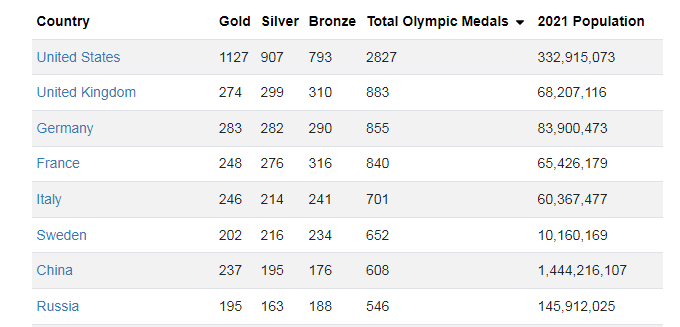 |ഒളിമ്പിക്സിലെ നാളിതുവരെയുള്ള മെഡല്നേട്ടങ്ങളുടെ എണ്ണം നോക്കുകയാണെങ്കില് അമേരിക്ക ബഹുദൂരം മുന്നിലാണ്. 2800ല്പരം മെഡലുകളാണ് ഒളിമ്പിക്സില് നിന്ന് യു.എസ് സ്വന്തം രാജ്യത്തേക്ക് എത്തിച്ചത്.