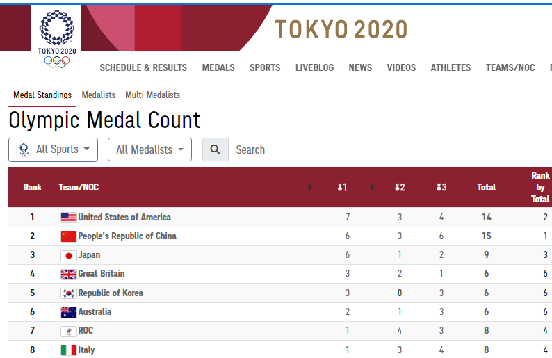 ആറ് സ്വര്ണവുമായി ചൈന രണ്ടാം സ്ഥാനത്ത് നില്ക്കുമ്പോള് തൊട്ടുപിന്നില് ആതിഥേയരായ ജപ്പാനും ഉണ്ട്. ചൈനയുടെ അത്രയും തന്നെ സ്വര്ണമെഡലുകള് ജപ്പാനും നേടിയിട്ടുണ്ട്. എങ്കിലും ആകെ മെഡലുകളുടെ എണ്ണത്തില് ജപ്പാന് മൂന്നാം സ്ഥാനത്താണ്. 15 മെഡലുകള് ചൈനയുടെ അക്കൌണ്ടില് എത്തിയപ്പോള് ഒന്പത് മെഡലുകളാണ് ജപ്പാന് നേടാനായത്. ജപ്പാന് പിന്നിലായി മൂന്ന് സ്വര്ണമെഡുകളുമായി ബ്രിട്ടന് നാലാം സ്ഥാനത്തുണ്ട്.