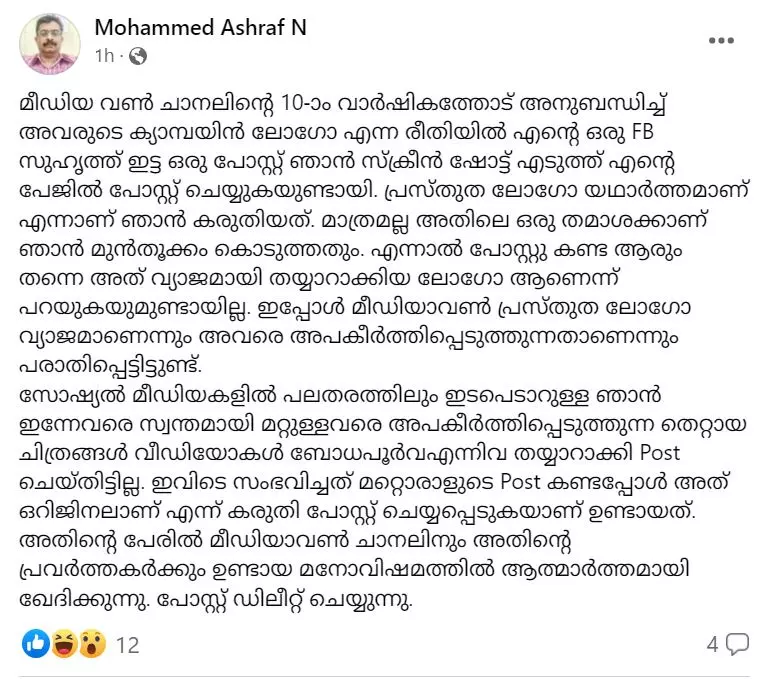 തന്റെ ഒരു സുഹൃത്ത് ഇട്ട പോസ്റ്റ് സ്ക്രീൻഷോട്ട് എടുത്താണ് താൻ പോസ്റ്റ് ചെയ്തതെന്നും ഇതിന്റെ പേരിൽ മീഡിയവൺ ചാനലിനും അതിന്റെ പ്രവർത്തകർക്കും ഉണ്ടായ മനോവിഷമത്തിൽ ആത്മാർത്ഥമായി ഖേദിക്കുന്നതായും മുഹമ്മദ് അഷ്റഫ് ഫേസ്ബുക്കിൽ കുറിച്ചു.