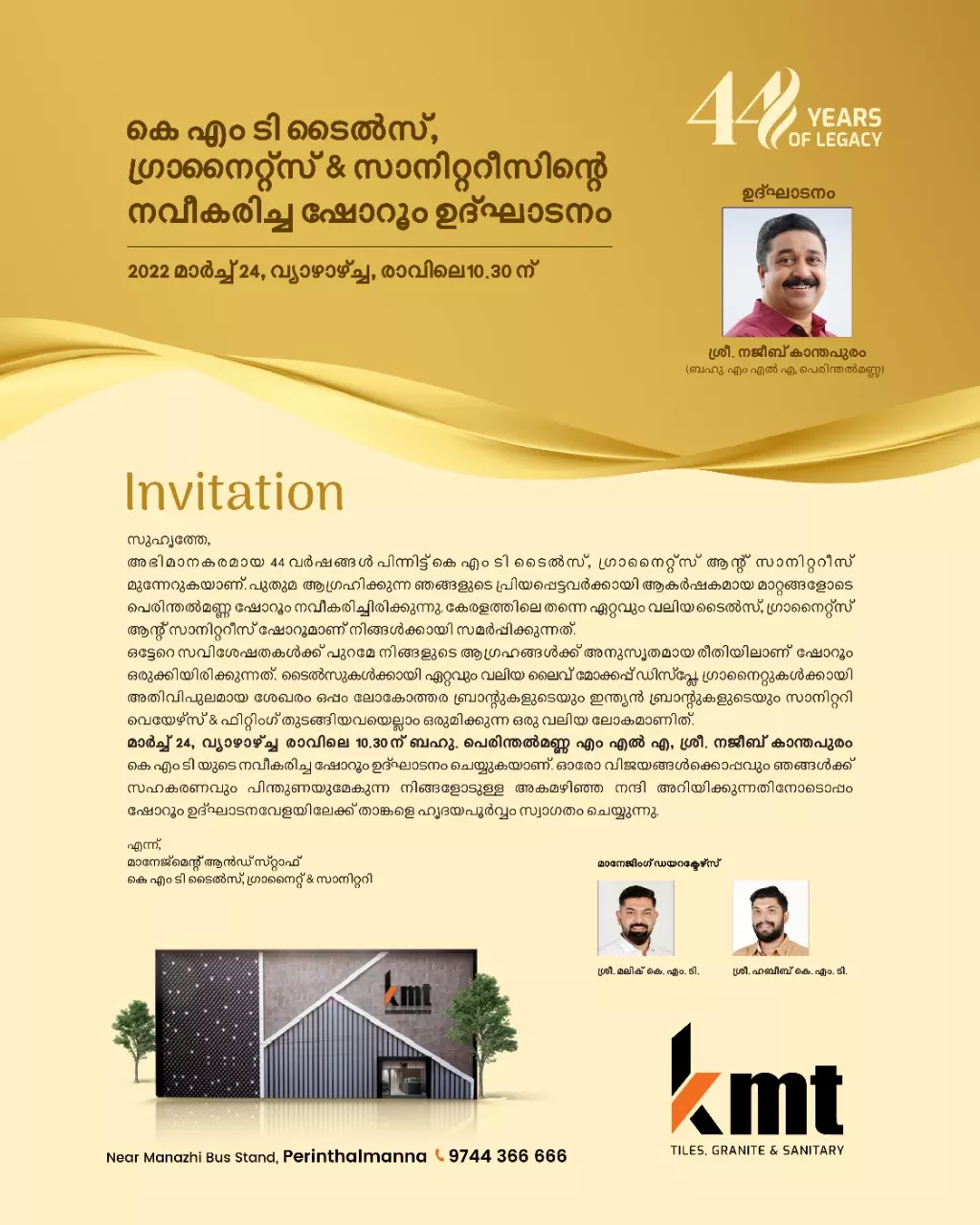 ടൈൽസ്, ഗ്രാനൈറ്റ് ആന്റ് സാനിറ്ററീസ് വിപണനരംഗത്ത് 44 വർഷത്തെ പ്രൗഢപാരമ്പര്യമുള്ള കെഎംടിയുടെ പെരിന്തൽമണ്ണയിലെ നവീകരിച്ച ഷോറൂമിന്റെ ഉദ്ഘാടനം മാർച്ച് 24, വ്യാഴാഴ്ച രാവിലെ 10.30ന്. എംഎൽഎ നജീബ് കാന്തപുരമാണ് ഉദ്ഘാടകന്. സാമൂഹിക സാംസ്കാരിക രാഷ്ട്രീയ രംഗത്തെ പ്രമുഖർ ചടങ്ങിൽ പങ്കെടുക്കും.