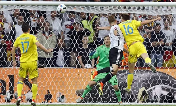 പക്ഷേ മാറ്റ് ഹമ്മല്സിന് പകരം ടീമിലെത്തിയ സെന്റര് ബാക്ക് മുസ്തഫിയിലൂടെ ഗോള് നേടി ജര്മനി മത്സരം വരുതിയിലാക്കി. ഓസിലിന്റെ ഫ്രീ കിക്കിന് മുസ്തഫി തലവെക്കാന് ഓടിയെത്തുമ്പോള് തടയാന് ഉക്രൈന് താരങ്ങള് ആരും ഉണ്ടായില്ല. വേഗതയേറിയ പ്രത്യാക്രമണങ്ങളായിരുന്നു ഗോളിനുള്ള ഉക്രൈന്റെ മറുപടി. കൊനോപ്ലിയങ്കയും യെര്മലോങ്കയും നിരന്തരം ജര്മന് ഗോള്മുഖത്തേക്ക് പന്തുമായെത്തി. കൊനോപ്ലിയങ്കയുടെ ഗോള് ശ്രമം മാന്യുവല് ന്യോയറിനെ മറികടന്നെങ്കിലും ഗോള്വരയില് നിന്ന് ജെറോം ബോട്ടെങ് രക്ഷിച്ചു. തൊട്ട് പിന്നാലെ യെര്മലെങ്കോയുടെ ഗോള് ഓഫ് സൈഡ് മൂലം നിഷേധിക്കപ്പെടുകയും ചെയ്തു.