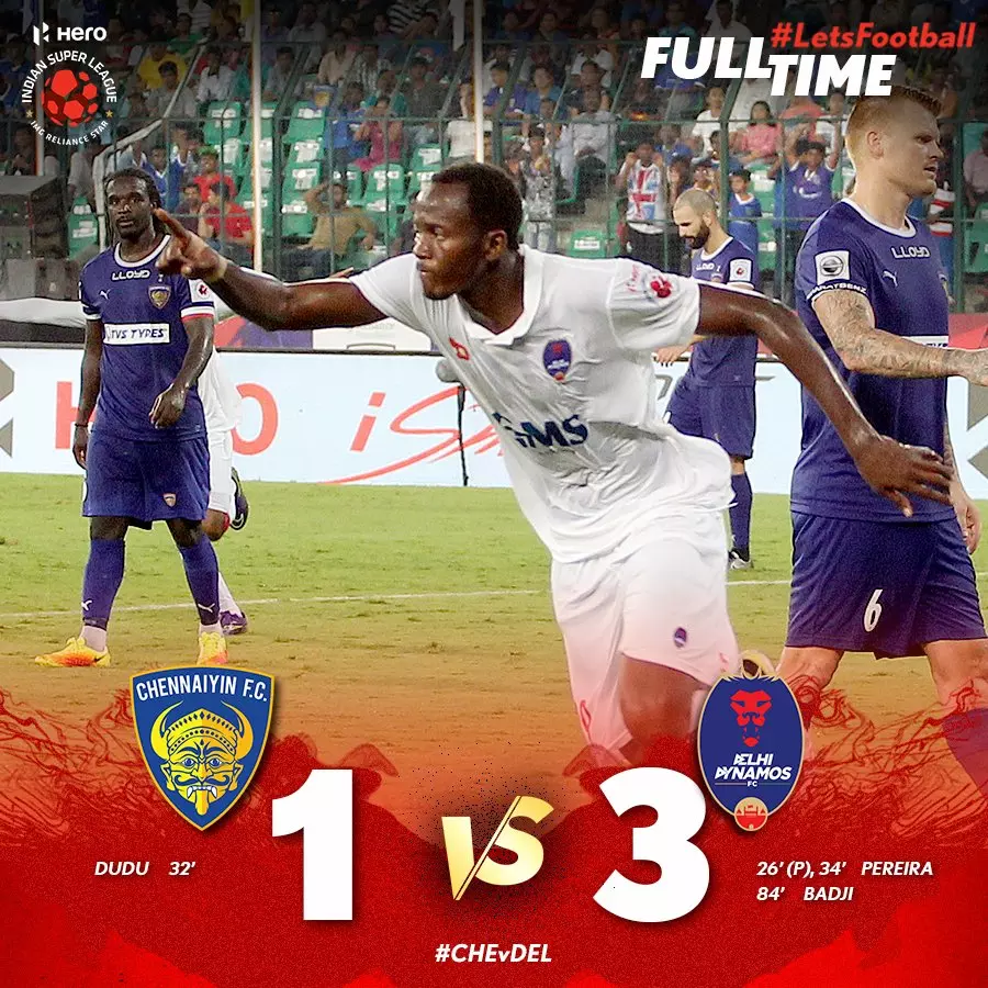 തിരിച്ചടിക്കാന് ചെന്നൈയിന് വഴികള് തേടിയെങ്കിലും സാധിച്ചില്ല. ഒടുവില് മത്സരം അവസാനിക്കാന് മിനിറ്റുകള് ബാക്കിനില്ക്കെ ബദാര ബാഡ്ജിയിലൂടെ ചെന്നൈയിന്റെ പെട്ടിയില് ഡല്ഹി ഡൈനാമോസ് അവസാന ആണിയും അടിച്ചു. കോല്ക്കത്തയില് നടന്ന ആദ്യമത്സരത്തില് നിലവിലുള്ള ചാമ്പ്യന്മാരായ ചെന്നൈയിന് അത്ലറ്റിക്കോ ഡി കൊല്ക്കത്തയുമായി സമനില പിടിച്ചിരുന്നു.
