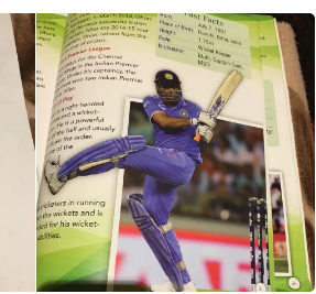 എന്റെ മൂത്ത മകന് ആര്യവീര് വരച്ച ധോണിയുടെ ചിത്രമാണിത്, ഈ ചിത്രത്തിലും ധോണി കൂറ്റനടികളുടെ പിന്നാലെയാണ് എന്ന അടിക്കുറിപ്പോടെയാണ്