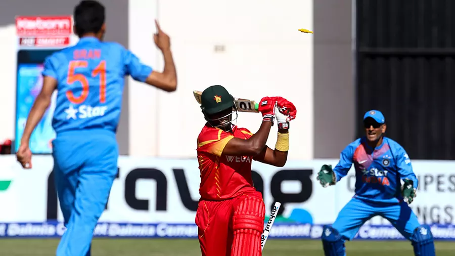 നേരത്തെ ടോസ് നേടി ബാറ്റിങ് തെരഞ്ഞെടുത്ത സിംബാബ്വേ ഇന്ത്യയുടെ പേസ് ബൌളര്മാര്ക്ക് മുന്നില് തകര്ന്നടിഞ്ഞു. നിശ്ചിത 20 ഓവറില് ഒമ്പത് വിക്കറ്റ് നഷ്ടത്തില് കേവലം 99 റണ്സ് മാത്രമാണ് ആതിഥേയര്ക്ക് കണ്ടെത്താനായത്. 31 റണ്സെടുത്ത പീറ്റര് മൂറാണ് സിംബാബ്വെയുടെ ടോപ്പ് സ്ക്കോറര്. കന്നി ട്വന്റി മത്സരത്തിനിറങ്ങിയ ഭരീന്ദര് സ്രാനായിരുന്നു ഇന്ത്യന് ബൌളര്മാരില് കൂടുതല് അപകടകാരി. നാല് ഓവറില് കേവലം പത്ത് റണ്സ് മാത്രം വഴങ്ങിയ സ്രാന് എറിഞ്ഞിട്ടത് നാല് വിക്കറ്റുകളാണ്. മൂന്ന് വിക്കറ്റുകളുമായി ഭൂംറ സിംബാബ്വേ വധത്തില് സ്രാന് മികച്ച പങ്കാളിയായി.