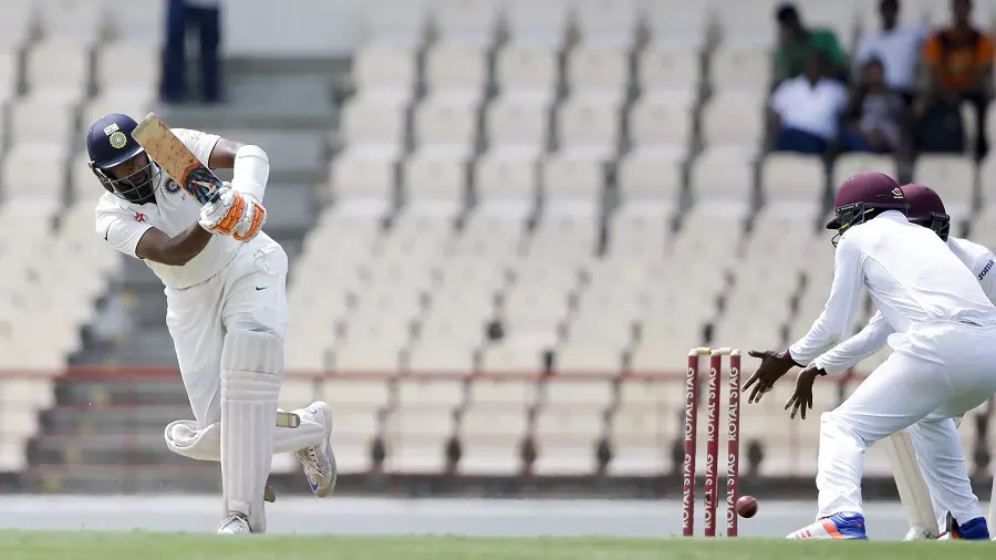 ടോസ് നഷ്ടപ്പെട്ട് ബാറ്റിംഗിനിറങ്ങിയ ഇന്ത്യ വന്തകര്ച്ചയാണ് നേരിട്ടത്. 87 റണ്സ് എടുക്കുന്നതിനിടയില് നാലു മുന്നിര ബാറ്റ്സ്മാരെ നഷ്ടമായ ഇന്ത്യയെ അശ്വിനും സാഹയും ചേര്ന്നുള്ള 108 റണ്സിന്റെ കൂട്ടുക്കെട്ടാണ് രക്ഷിച്ചത്. സ്കോര്കാര്ഡില് ഒമ്പതു റണ്സുള്ളപ്പോള് ഇന്ത്യക്ക് ശിഖര് ധവാന്റെ രൂപത്തില് ആദ്യ വിക്കറ്റ് നഷ്ടമായി. പിന്നാലെ നായകന് വിരാട് കോഹ്ലിയും(3) പുറത്തായി. ക്രീസില് ഒത്തുച്ചേര്ന്ന കെ.എല്. രാഹുല്(50), അജിങ്ക്യ രഹാനെ(35) കൂട്ടുക്കെട്ട് 58 റണ്സ് എടുത്തെങ്കിലും അധികം വൈകാതെ പിരിഞ്ഞു. രോഹിത് ശര്മയും(8) പൊരുതാതെ കീഴടങ്ങുകയായിരുന്നു. വിന്ഡീസിനു വേണ്ടി റോസ്റ്റണ് ചേസും അല്സാരി ജോസഫും രണ്ടും ഷാനോണ് ഗബ്രിയേല് ഒരു വിക്കറ്റും വീഴ്ത്തി.