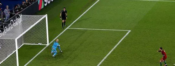 മത്സരത്തിന്റെ വിധി നിര്ണയിക്കപ്പെട്ടു എന്ന് കരുതപ്പെടും വിധം എഴുപത്തി ഒന്പതാം മിനിറ്റില് പോര്ച്ചുഗലിന് ഒരു പെനാലിറ്റിയും ലഭിച്ചു. പന്തുമായി പെനാല്റ്റി ബോക്സ് കടന്നെത്തിയ ക്രിസ്റ്റ്യാനോയെ മാര്ടീന് ഹിന്ടരേഗര് മറിച്ചിട്ടപ്പോള് ലോകത്തിലെ മികച്ച റഫറി ആയി തെരെഞ്ഞെടുകപ്പെട്ട ഇറ്റലിക്കാരന് റിറ്റ്സോളി നേരെ പെനാല്റ്റി പോയിന്റിലേക്ക് വിരല് ചൂണ്ടി. ഷുവര് ഷൂട്ടര് എന്നാ വിശേഷണമുള്ള സി ആര് 7 തന്നെ അതെടുക്കാനെത്തിയപ്പോള് പോര്ച്ചുഗലിന്റെ വിജയം ഉറപ്പിച്ചു കഴിഞ്ഞിരുന്നു. എന്നാല് സകലരെയും അതിശയിപ്പിച്ചുകൊണ്ട് ക്രിസ്റ്റ്യാനോയുടെ പ്ലെസിംഗ് ഷോട്ട്. ഇടതു പോസ്റ്റിന്റെ മൂലയില് തട്ടി മടങ്ങിയതോടെ നിര്ഭാഗ്യം റൊണിക്കും പൊര്ച്ചുഗലിനും ഒപ്പമായി. ഉറപ്പായിരുന്ന വിജയം കൈ വിട്ടുകളഞ്ഞ പോര്ച്ചുഗീസുകാര് ദുഃഖ പുത്രന്മാരായി തല കുനിച്ചപ്പോള് അവരുടെ പ്രീ ക്വാര്ട്ടര് പ്രവേശനവും ആശങ്കയുണര്ത്തുന്നതാക്കി.