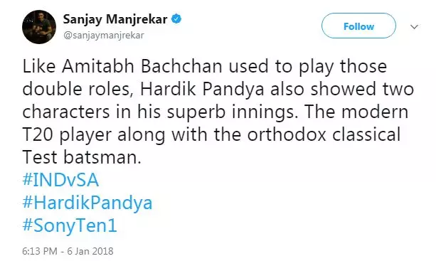 ദക്ഷിണാഫ്രിക്കക്കെതിരായ ആദ്യ ടെസ്റ്റില് ഇന്ത്യയുടെ നില പരുങ്ങലിലായപ്പോഴാണ് രക്ഷകനായി ഹാര്ദിക് പാണ്ഡ്യ അവതരിച്ചത്. 93 റണ്സ് നേടി ടീമിന് നെടുംതൂണായ പാണ്ഡ്യ പിന്നീട് ബൗളിംങിനിറങ്ങിയപ്പോള് ദക്ഷിണാഫ്രിക്കന് ഓപണര്മാരെ പുറത്താക്കുകയും ചെയ്തിരുന്നു. പാണ്ഡ്യയുടെ ഈ പ്രകടനം അമിതാഭ് ബച്ചന്റെ ചില സിനിമകളിലെ ഇരട്ടവേഷത്തിലെ പ്രകടനത്തോടാണ് സഞ്ജയ് മഞ്ജരേക്കര് ഉപമിച്ചത്.