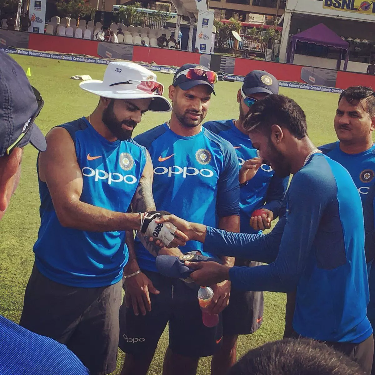 |മത്സരത്തിന് മുമ്പ് നായകന് വിരാട് കൊഹ്ലി പാണ്ഡ്യക്ക് ഇന്ത്യന് തൊപ്പി ഔദ്യോഗികമായി സമ്മാനിച്ചു