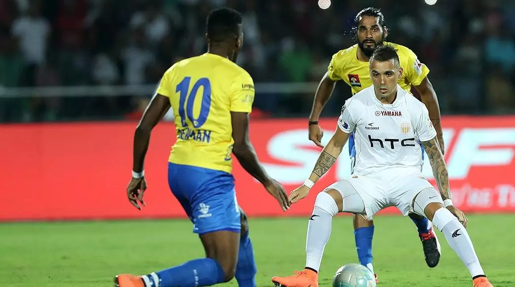 ഗുവാഹത്തിയിലെ സ്വന്തം തട്ടകത്തില് നോര്ത്ത് ഈസ്റ്റ് യുണൈറ്റഡിന് തന്നെയായിരുന്നു ആധിപത്യം. ആദ്യ പകുതിയില് പ്രതിരോധത്തിലൂന്നിയ ഇരുടീമുകള്ക്കും ഗോള് നേടാന് കഴിഞ്ഞില്ല. 55ാം മിനിറ്റിലാണ് നോര്ത്ത് ഈസ്റ്റ് യുണൈറ്റഡ് മലയാളികളുടെ ആവേശമായ ബ്ലാസ്റ്റേഴ്സിന്റെ വലയില് വെടിപൊട്ടിച്ചത്. നോര്ത്ത് ഈസ്റ്റിനായി ജപ്പാന് താരം കത് സൂമി യൂസയാണ് ഗോള് സ്വന്തമാക്കിയത്. നിക്കോളാസ് വെലസിന്റെ പാസിൽ കത് സൂമി പന്തിനെ കൃത്യമായി വലയിലെത്തിക്കുകയായിരുന്നു. പിന്നീടങ്ങോട്ട് ഒരുപിടി മികച്ച മുന്നേറ്റങ്ങള് നടത്തിയ ബ്ലാസ്റ്റേഴ്സ്, കൂടുതല് ഗോള് വഴങ്ങാതിരിക്കാന് പ്രതിരോധത്തിലും പിടിമുറുക്കി. എന്നാല് നോര്ത്ത് ഈസ്റ്റിന്റെ തട്ടകത്തില് അവരെ സമനിലയില് തളക്കുകയെന്ന ലക്ഷ്യത്തിലേക്ക് കൊമ്പന്മാര്ക്ക് എത്താനായില്ല.