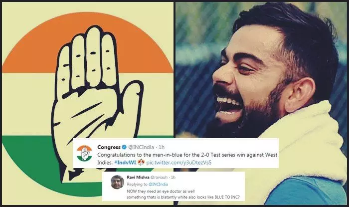 വെസ്റ്റ് ഇന്റീസിനെതിരെ 2-0ത്തിന് പരമ്പര വിജയിച്ച 'മെന് ഇന് ബ്ലു'വിന് അഭിനന്ദനങ്ങള് എന്നാണ് പോസ്റ്റ്. ഇതിലെ മെന് ഇന് ബ്ലു എന്ന പരാമര്ശമാണ് തെറ്റ്. ഏകദിനം കളിക്കുന്ന ഇന്ത്യന് ടീമിനെയാണ് മെന് ഇന് ബ്ലു എന്ന് വിളിക്കുന്നത്. പക്ഷെ, ടെസ്റ്റ് വിജയം കൈവരിച്ച ടീമിന് എന്തിന് മെന് ഇന് ബ്ലു എന്ന് അഭിസംബോധന ചെയ്തുവെന്നാണ് ചോദിച്ചാണ് സാമൂഹ്യ മാധ്യമങ്ങളില് കോണ്ഗ്രസിനെതിരെ പ്രതികരണങ്ങള് ഉയരുന്നത്.