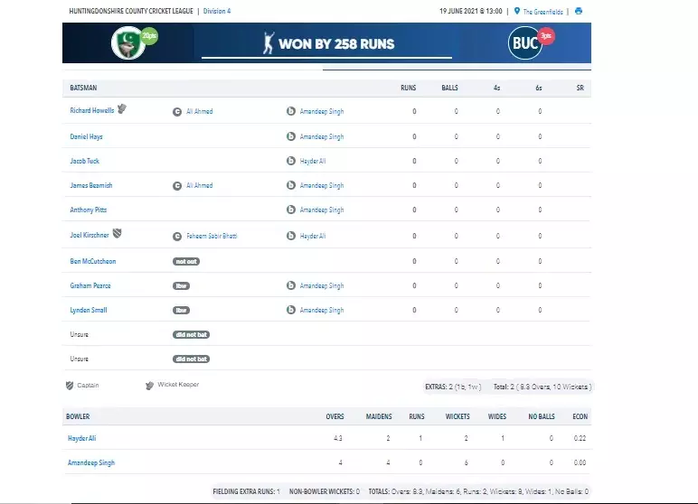 നാല് ഓവറിൽ ആറ് വിക്കറ്റ് നേടിയ അമൻദീപ് സിങാണ് ബക്ക്ഡൺ ക്രിക്കറ്റ് ക്ലബ് ഏറ്റുവാങ്ങിയ നാണക്കേടിൽ ഏറ്റവും വലിയ പങ്കുവഹിച്ചത്.