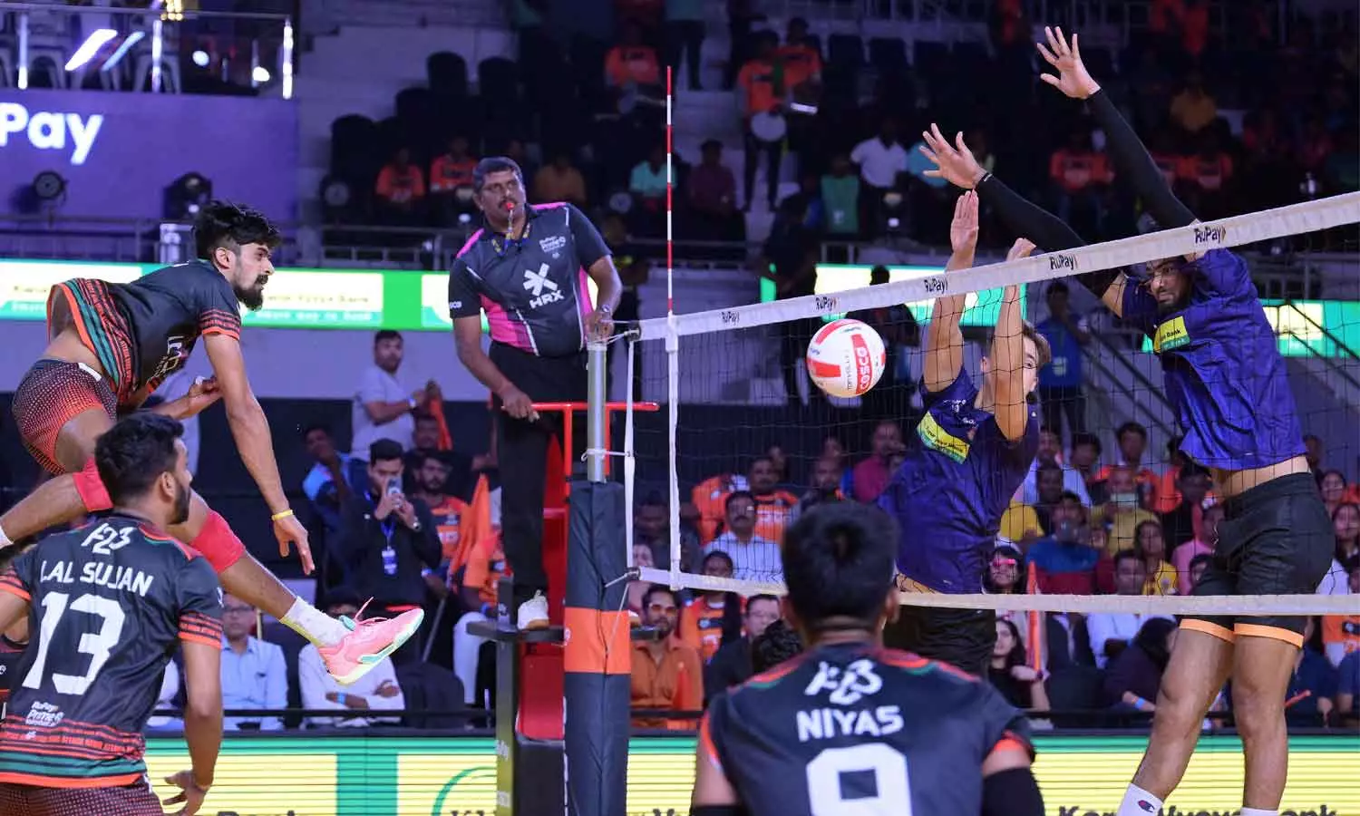 സേതു തകര്പ്പന് സെര്വുകളിലൂടെ ഹൈദരാബാദിന്റെ പ്രതിരോധത്തെ വിറപ്പിച്ചു. ഹൈദരാബാദിനായി സാഹില് കുമാര് ആക്രമണത്തിന് ശ്രമിച്ചെങ്കിലും സ്രജന് ഷെട്ടി പ്രതിരോധം തീര്ത്തു.