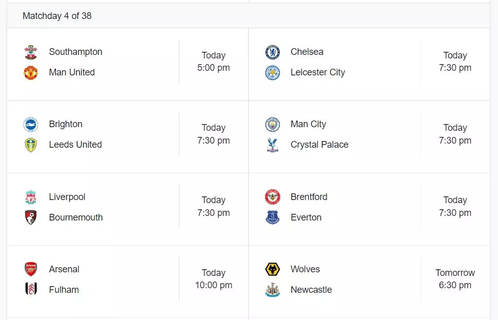 ഇംഗ്ലീഷ് പ്രീമിയർ ലീഗ് ഫുട്ബോൾ നാലാം വാരത്തിലേക്ക് കടക്കുന്ന ഇന്ന് ആരാധകരെ കൊതിപ്പിക്കുന്ന മത്സരങ്ങളാണ് നടക്കുന്നത്. കരുത്തരായ മാഞ്ചസ്റ്റർ സിറ്റി, ലിവർപൂൾ, ചെൽസി, ആഴ്സണൽ, മാഞ്ചസ്റ്റർ യുനൈറ്റഡ്, എവർട്ടൻ തുടങ്ങി കളത്തിലിറങ്ങുന്ന വൻതോക്കുകൾക്കെല്ലാം പ്രതീക്ഷയ്ക്കൊപ്പം ആശങ്ക കൂടിയുണ്ട്. ഇന്ത്യൻ സമയം വൈകിട്ട് അഞ്ച് മുതൽ ആണ് മത്സരങ്ങൾ ആരംഭിക്കുന്നത്.