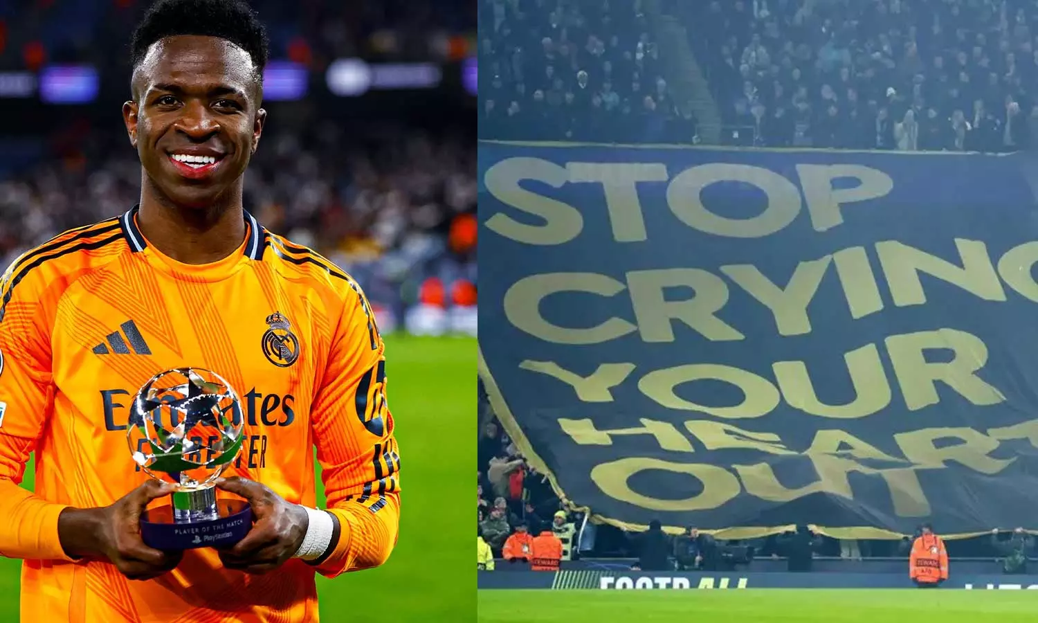 ഇന്നലെ ഇത്തിഹാദ് ഗാലറിയിൽ വിനീഷ്യസിനെ പരിഹസിച്ചൊരു ബാനർ സിറ്റി ആരാധകർ ഉയർത്തിയിരുന്നു. സ്പാനിഷ് മിഡ്ഫീൽഡർ റോഡ്രി ബാലൻദ്യോർ പുരസ്കാരത്തിൽ ചുംബിച്ച് നിൽക്കുന്ന ചിത്രത്തിൽ 'കരച്ചിൽ നിർത്തൂ എന്നാണ്' ആരാധകര് എഴുതിയിട്ടിരുന്നത്. റയലിന്റെ വിജയത്തിന് ശേഷം ഇതിനെ കുറിച്ച് വിനീഷ്യസിനോട് മാധ്യമ പ്രവർത്തകർ ചോദ്യമുന്നയിച്ചു