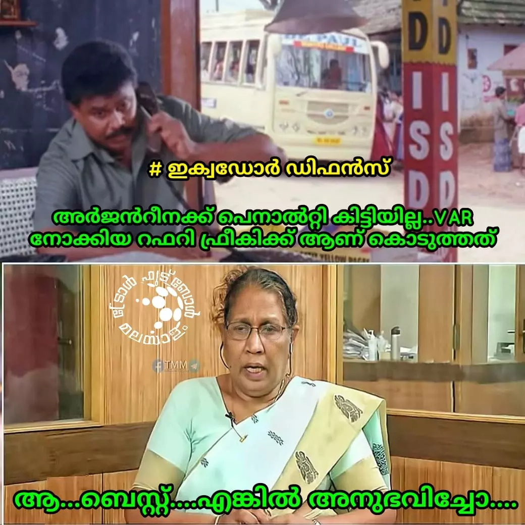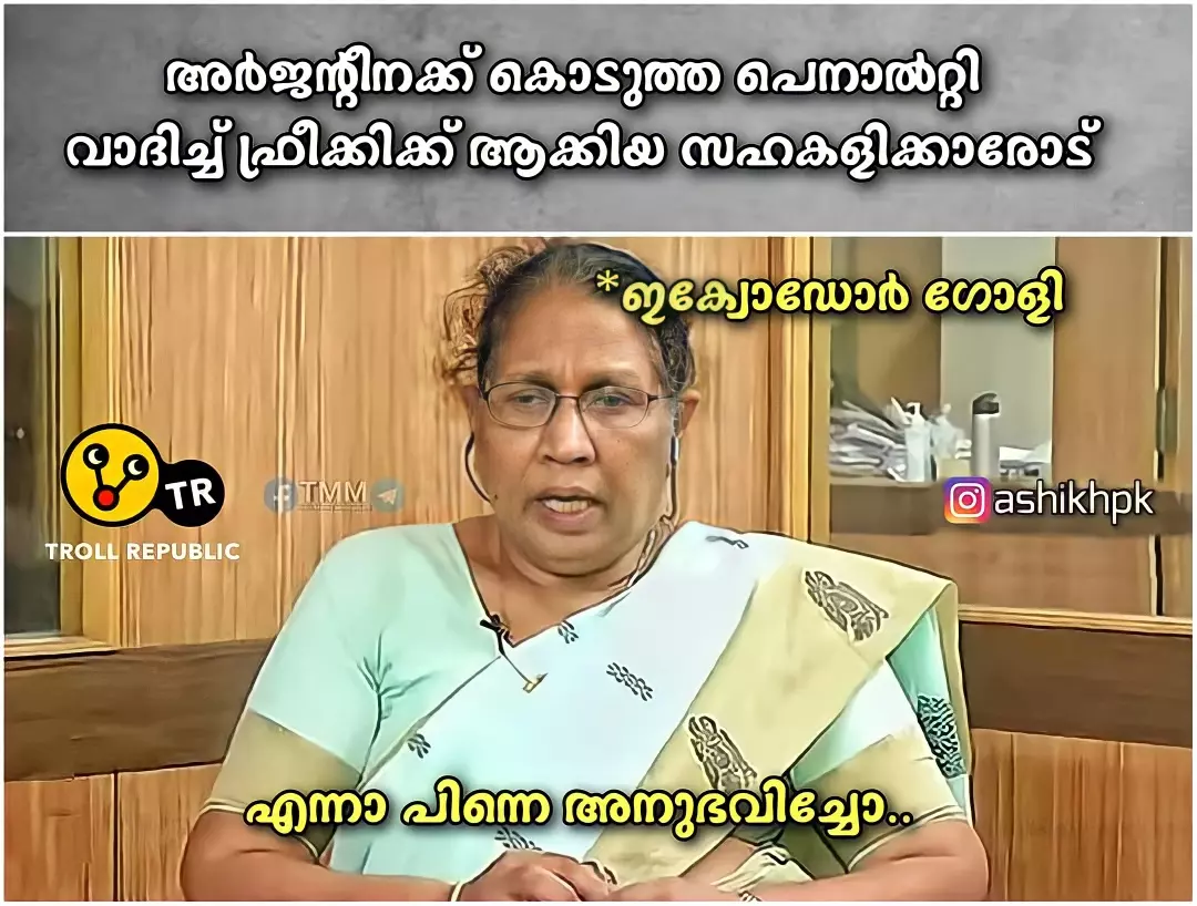അർജന്റീനക്ക് ലഭിച്ച പെനാൽറ്റി വാദിച്ച് ഫ്രീ കിക്ക് ആക്കിയ സഹകളിക്കാരോട് ഇക്വഡോർ ഗോളി 'എന്നാ പിന്നെ അനുഭവിച്ചോ...' എന്നു പറയുന്നതാണ് ഇതില് ഏറ്റവും രസരകമായ ട്രോളുകളിലൊന്ന്. മുന് വനിതാ കമ്മീഷന് അധ്യക്ഷ എം.സി ജോസഫൈന്റെ വിവാദമായ പരാമര്ശങ്ങളില് ഒന്നായിരുന്നു ഈ വാക്കുകള്. രാഷ്ട്രീയ കേരളം വലിയ രീതിയില് ചര്ച്ച ചെയ്യുകയും ജോസഫൈന്റെ രാജിക്ക് കാരണമാകുകയും ചെയ്ത പരാമര്ശമാണ് ട്രോളന്മാര് ഇത്തവണ ആഘോഷമാക്കിയത്.