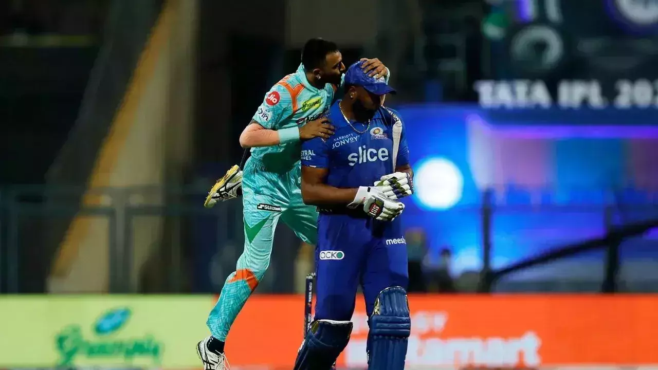 ഐ.പി.എല്ലിൽ തുടർച്ചയായ എട്ടാം തോൽവി ഏറ്റു വാങ്ങിയ മുംബൈ ഇന്ത്യൻസ് ഏറെക്കുറെ ഇക്കുറി സെമി കാണാതെ പുറത്താവുമെന്ന് ഉറപ്പായിക്കഴിഞ്ഞു. കഴിഞ്ഞ ദിവസം ലക്നൗ സൂപ്പർ ജയന്റ്സിനെതിരെയാണ് മുംബൈ തോൽവി ഏറ്റുവാങ്ങിയത്. 36 റൺസിനായിരുന്നു ലക്നൗവിന്റെ ജയം. മത്സരത്തിനിടെ ചില നാടകീയ രംഗങ്ങളും അരങ്ങേറി.. മുംബൈ ഇന്ത്യൻസ് താരം കീറോൺ പൊള്ളാർഡിന്റെ വിക്കറ്റ് നേടിയ ശേഷം ലക്നൗ താരം ക്രുണാൽ പാണ്ഡ്യ വിക്കറ്റ് നേട്ടം ആഘോഷിച്ചത് പൊള്ളാർഡിന തന്നെ ചുമലിൽ ചാടിക്കയറിയായിരുന്നു. വിക്കറ്റ് വീണയുടൻ നിശബ്ദമായി പവലിയനിലേക്ക് മടങ്ങുകയായിരുന്ന പൊള്ളാർഡിന് അടുത്തേക്ക് ഓടിയെത്തിയ താരം പൊള്ളാർഡിന്റെ ചുമലിൽ ചാടിക്കയറി തലയിൽ ഉമ്മ വച്ചു. ക്രുണാലിന്റെ ഈ ആഘോഷം വലിയ വിമര്ശനങ്ങള് ഏറ്റു വാങ്ങുകയാണിപ്പോള്.