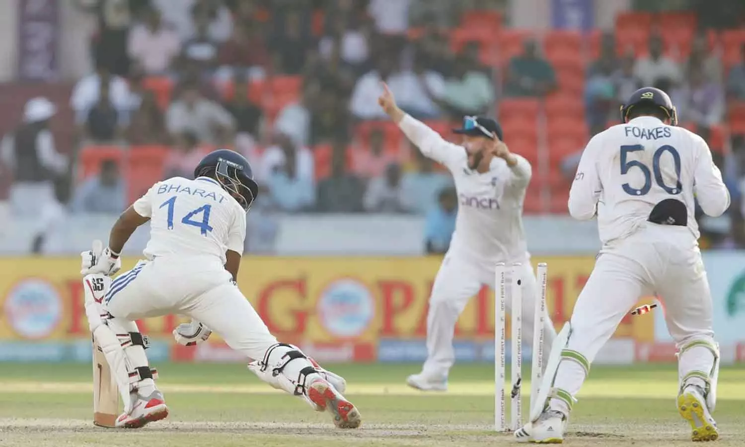 രണ്ടാം ഇന്നിങ്സിന്റെ ഒരു ഘട്ടത്തിൽ ഇന്ത്യ, 119ന് ഏഴ് എന്ന തകർന്ന നിലയിലായിരുന്നു. വേഗത്തിൽ കളി അവസാനിപ്പിക്കും എന്ന് തോന്നിച്ചിടത്ത് നിന്ന് എട്ടാം വിക്കറ്റിൽ ഇന്ത്യയെ കെ.എസ് ഭരതും രവിചന്ദ്ര അശ്വിനും ചേര്ന്ന് മോഹിപ്പിച്ചു. പതിയെ ഇന്നിങ്സ് കെട്ടിപ്പൊക്കിയ സഖ്യം 50 റൺസിന്റെ കൂട്ടുകെട്ടും സൃഷ്ടിച്ചു. അതോടെ ഇന്ത്യക്ക് പ്രതീക്ഷയായി. എന്നാൽ ഹാർട്ലിയുടെ മികച്ചൊരു പന്തിൽ ഭരത്(28) ക്ലീൻബൗൾഡ്. പിന്നാലെ ഹാർട്ലിയെ തന്നെ ക്രീസിന് വെളിയിലിറങ്ങി ശിക്ഷിക്കാൻ നോക്കിയ അശ്വിനും(28) വീണു.