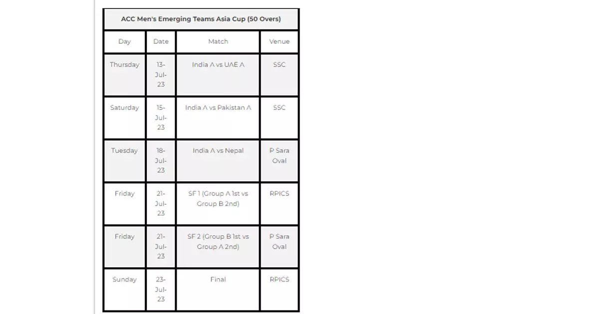 2023ലെ എസിസി എമേർജിംഗ് ടീം ഏഷ്യാകപ്പിനുള്ള ഇന്ത്യ എ സ്ക്വാഡിനെ പ്രഖ്യാപിച്ചു. ജൂലൈ 13 മുതൽ 23 വരെയായി ശ്രീലങ്കയിലെ കൊളംബോയിൽ നടക്കുന്ന ടൂർണമെൻറിനുള്ള ഇന്ത്യൻ ടീമിനെ ജൂനിയർ ക്രിക്കറ്റ് കമ്മിറ്റിയാണ് തിരഞ്ഞെടുത്തത്. യാഷ് ദുല്ലാണ് ടീമിനെ നയിക്കുക. അഭിഷേക് ശർമയാണ് ഉപനായകൻ. പ്രബ്സിമ്രാൻ സിംഗ് വിക്കറ്റ് കീപ്പറാണ്. ഇവർക്ക് പുറമേ ഐപിഎല്ലിൽ തിളങ്ങിയ നിരവധി താരങ്ങളാണ് ടീമിൽ ഇടംപിടിച്ചിരിക്കുന്നത്. ഗുജറാത്ത് ടൈറ്റൻസിന്റെ സായ് സുദർശൻ, രാജസ്ഥാൻ റോയൽസിന്റെ ധ്രുവ് ജുറേൽ, റിയാൻ പരേഗ് തുടങ്ങിയവരൊക്കെ ടീമിലുണ്ട്.