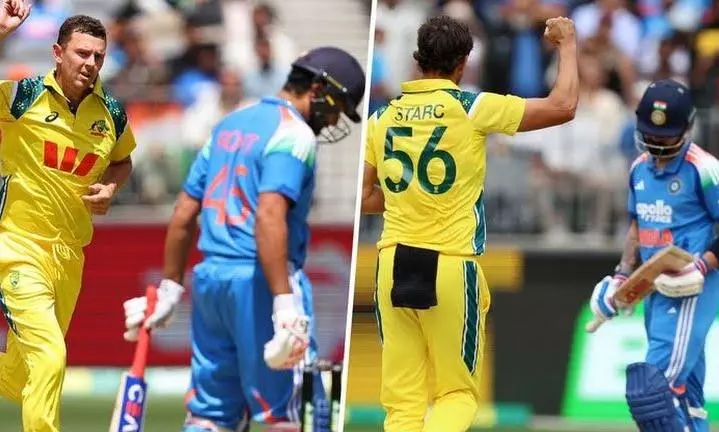 ടോസ് നഷ്ടപ്പെട്ട് ബാറ്റിങ്ങിനിറങ്ങിയ ഇന്ത്യക്ക് എട്ട് റൺസെടുത്ത രോഹിത് ശർമയെയാണ് ആദ്യം നഷ്ടമായത്. പിന്നാലെ സ്റ്റാർക്കിന്റെ പന്തിൽ കൂപ്പർ കനോലിക്ക് പിടികൊടുത്ത് റൺസൊന്നുമെടുക്കാതെ വിരാട് കോഹ്ലിലും പുറത്ത്. പിന്നാലെ ക്യാപ്റ്റൻ ശുഭ്മാൻ ഗില്ലും (10) മടങ്ങിയതോടെ കാര്യങ്ങൾ ഏറെക്കുറെ തീരുമാനമയി. ശ്രേയസ് അയ്യർ (11), അക്സർ പട്ടേൽ (38), വാഷിങ്ടൺ സുന്ദർ (10), നിതീഷ് കുമാർ റെഡ്ഢി (19 നോട്ട്ഔട്ട്), അർഷ്ദീപ് സിങ് (0) എന്നിങ്ങനെയാണ് മറ്റുള്ളവരുടെ സ്കോറുകൾ.
