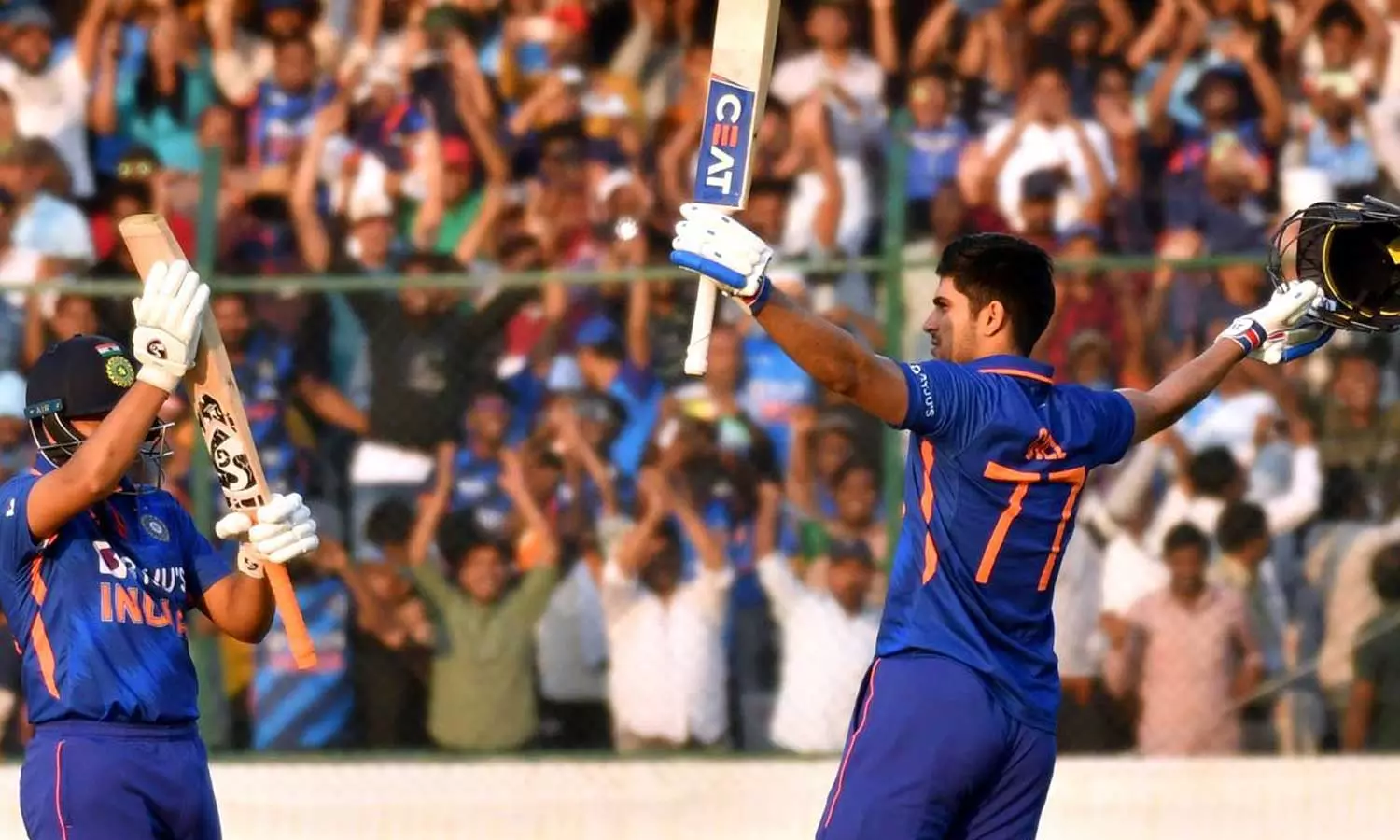 ഹൈദരാബാദിലെ നിറഞ്ഞ കാണികള്ക്ക് മുന്നില് ബാറ്റുയര്ത്തുന്ന ശുഭ്മാന് ഗില്