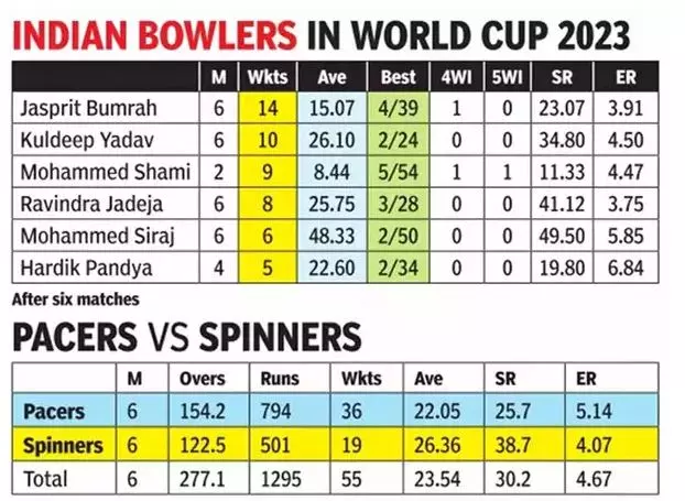 കളിച്ച ആറിലും ജയിച്ച ഇന്ത്യക്കായി ഏറ്റവും കൂടുതൽ വിക്കറ്റ് നേടിയത് ബുംറയാണ്. 14 വിക്കറ്റുകളാണ് ബുംറയുടെ പേരിലുള്ളത്. 39 റൺസ് വഴങ്ങി നാല് വിക്കറ്റ് വീഴ്ത്തിയതാണ് മികച്ച പ്രകടനം. രണ്ട് മത്സരങ്ങൾ മാത്രം കളിച്ച മുഹമ്മദ് ഷമിയാകട്ടെ ഒമ്പത് വിക്കറ്റുകൾ വീഴ്ത്തിക്കഴിഞ്ഞു. 54 റൺസ് വിട്ടുകൊടുത്ത് അഞ്ച് വിക്കറ്റ് വീഴ്ത്തിയതാണ് ശ്രദ്ധേയ പ്രകടനം. സിറാജിന് ആറ് മത്സരങ്ങളിൽ നിന്ന് അത്രയും വിക്കറ്റുകളുണ്ട്. പരിക്കേറ്റങ്കിലും നാല് മത്സരങ്ങളിൽ അഞ്ച് വിക്കറ്റ് വീഴ്ത്തിയ പാണ്ഡ്യയും പിന്നിലല്ല. ആകെ 36 വിക്കറ്റുകളാണ് പേസർമാർ വീഴ്ത്തിയത്. വിട്ടുകൊടുത്തത് 794 റൺസും.