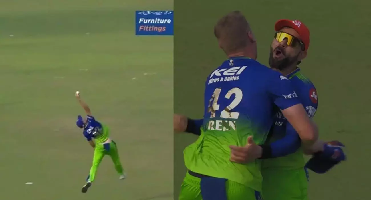 8.1 ഉയരത്തിൽ പറന്ന പന്താണ് ഓസീസ് താരം ഉയർന്നു ചാടി കൈയിലൊതുക്കിയത്. പന്ത്കാണുക പോലും ചെയ്യാതെ ഒറ്റ കൈയിലായിരുന്നു ഈ അത്ഭുത പ്രകടനം. കഴിഞ്ഞ മത്സരങ്ങളിലെല്ലാം തകർത്തടിച്ച രഘുവംശി മൂന്ന് റൺസുമായി പുറത്ത്. ഇതോടെ പവർപ്ലെയിൽ മൂന്ന് വിക്കറ്റാണ് കൊൽക്കത്തക്ക് നഷ്ടമായത്. മത്സരത്തിലുടനീളം ഈഡൻഗാർഡനിൽ ഫീൽഡിങിൽ മികച്ച പ്രകടനമാണ് ബെംഗളൂരു പുറത്തെടുത്തത്.