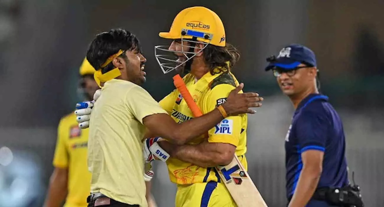 |മോദി സ്റ്റേഡിയത്തിൽ നടന്ന ഐ.പി.എൽ മത്സരത്തിനിടെയാണ് സുരക്ഷാ ഉദ്യോഗസ്ഥരുടെ കണ്ണുവെട്ടിച്ച് ആരാധകൻ ധോണിക്കരികിലേക്കെത്തിയത്.