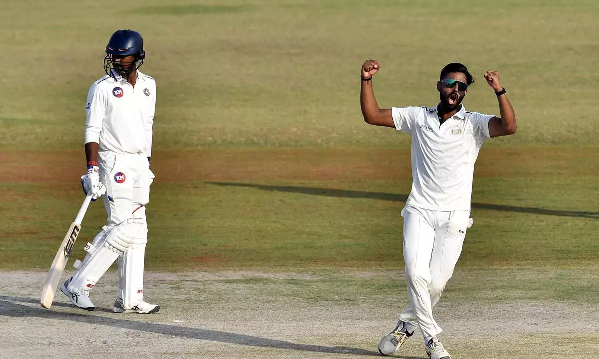 അവസാന ദിവസം കളി തുടങ്ങുമ്പോൾ ബാബ അപരാജിത്തും അഹ്മദ് ഇമ്രാനും ചേർന്നുള്ള കൂട്ടുകെട്ടിലായിരുന്നു കേരളത്തിൻ്റെ പ്രതീക്ഷ. ഇരുവരും ചേർന്ന് 20 റൺസ് കൂടി കൂട്ടിച്ചേർത്തു. അർദ്ധസെഞ്ച്വറി പൂർത്തിയാക്കി നിലയുറപ്പിച്ചെന്ന് തോന്നിച്ച ഘട്ടത്തിലാണ് ബാബ അപരാജിത് പുറത്തായത്.51 റൺസെടുത്ത അപരാജിത് ആയുഷ് ഗോയലിൻ്റെ പന്തിൽ ക്ലീൻ ബൌൾഡാവുകയായിരുന്നു. തുടർന്നെത്തിയ ഷോൺ റോജറിനൊപ്പം ചേർന്ന് അഹ്മദ് ഇമ്രാൻ ഇന്നിങ്സ് മുന്നോട്ട് നീക്കി. എട്ടാം വിക്കറ്റിൽ 78 റൺസാണ് ഇരുവരും ചേർന്ന് കൂട്ടിച്ചേർത്തത്. കേരളത്തിൻ്റെ ഇന്നിങ്സിലെ ഏറ്റവും മികച്ച കൂട്ടുകെട്ടും ഇത് തന്നെയായിരുന്നു.