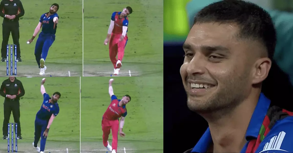 |കൈകളുടേയും കാലുകളുടേയും ചലനവും ബൗളിങ് ആക്ഷനും എല്ലാം ബുംറയുടേതിന് സമാനമായിരുന്നു. ഈ സാമ്യം കമന്റേറ്റര്മാര് ചൂണ്ടിക്കാട്ടിയപ്പോള് ഇരുവരും ബൗള് ചെയ്യുന്നത് സ്ക്രീനില് തെളിഞ്ഞു. ഇതുകണ്ടതോടെ ഡഗ്ഔട്ടില് ഇരിക്കുകയായിരുന്ന നവീനുല് ഹഖിന് ചിരിയടക്കാനായില്ല