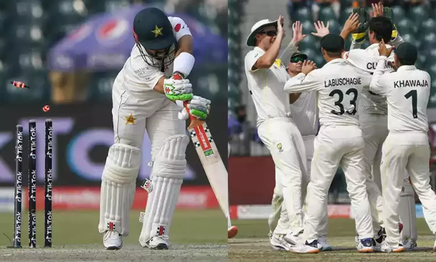 ആസ്ട്രേലിയയ്ക്കെതിരായ മൂന്നാം ക്രിക്കറ്റ് ടെസ്റ്റിൽ കരുത്തുറ്റ നിലയിൽനിന്ന് വൻ തകർച്ചയിലേക്കു കൂപ്പുകുത്തി പാകിസ്താന്. നാല് റണ്സ് കൂട്ടിച്ചേര്ക്കുന്നതിന് ഇടയില് അഞ്ച് വിക്കറ്റുകളാണ് ആസ്ട്രേലിയ പിഴുതത്.