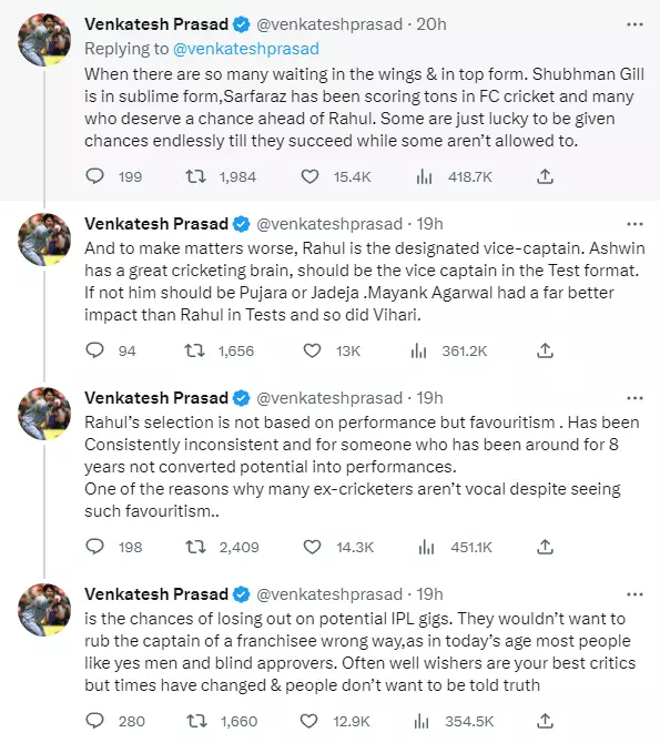 കെ.എല് രാഹുല്- വെങ്കടേഷ് പ്രസാദ്'രാഹുലിനെ ടീമിലെടുക്കുന്നത് ഫോം നോക്കിയല്ല': തുറന്നടിച്ച് വെങ്കടേഷ് പ്രസാദ്, അഞ്ച് ട്വീറ്റുകൾ