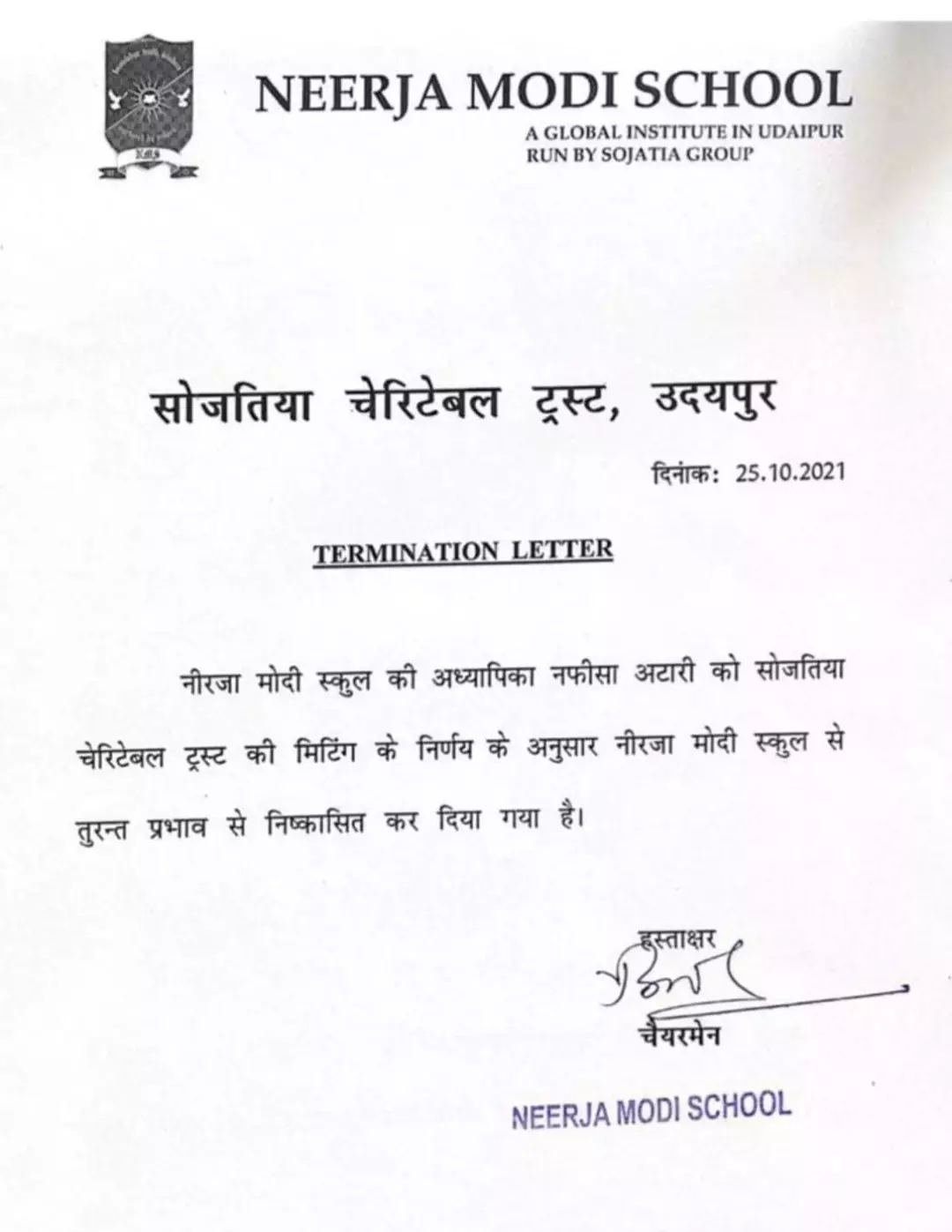 'ഞങ്ങൾ ജയിച്ചു' എന്ന അടിക്കുറിപ്പോടെയാണ് അവർ ഫോട്ടോ പങ്കുവച്ചത്. സ്റ്റാറ്റസ് കണ്ടതോടെ ഒരു കുട്ടിയുടെ രക്ഷിതാവ് നിങ്ങൾ പാകിസ്താനെയാണോ പിന്തുണയ്ക്കുന്നത് എന്നു ചോദിച്ചു. 'അതേ' എന്നായിരുന്നു അധ്യാപികയുടെ മറുപടി. പിന്നാലെ സ്റ്റാറ്റസ് സോഷ്യൽ മീഡിയയിൽ പ്രചരിച്ചു. തുടർന്നാണ് മാനേജ്മെന്റ് ഇവർക്കെതിരെ നടപടിയെടുത്തത്.