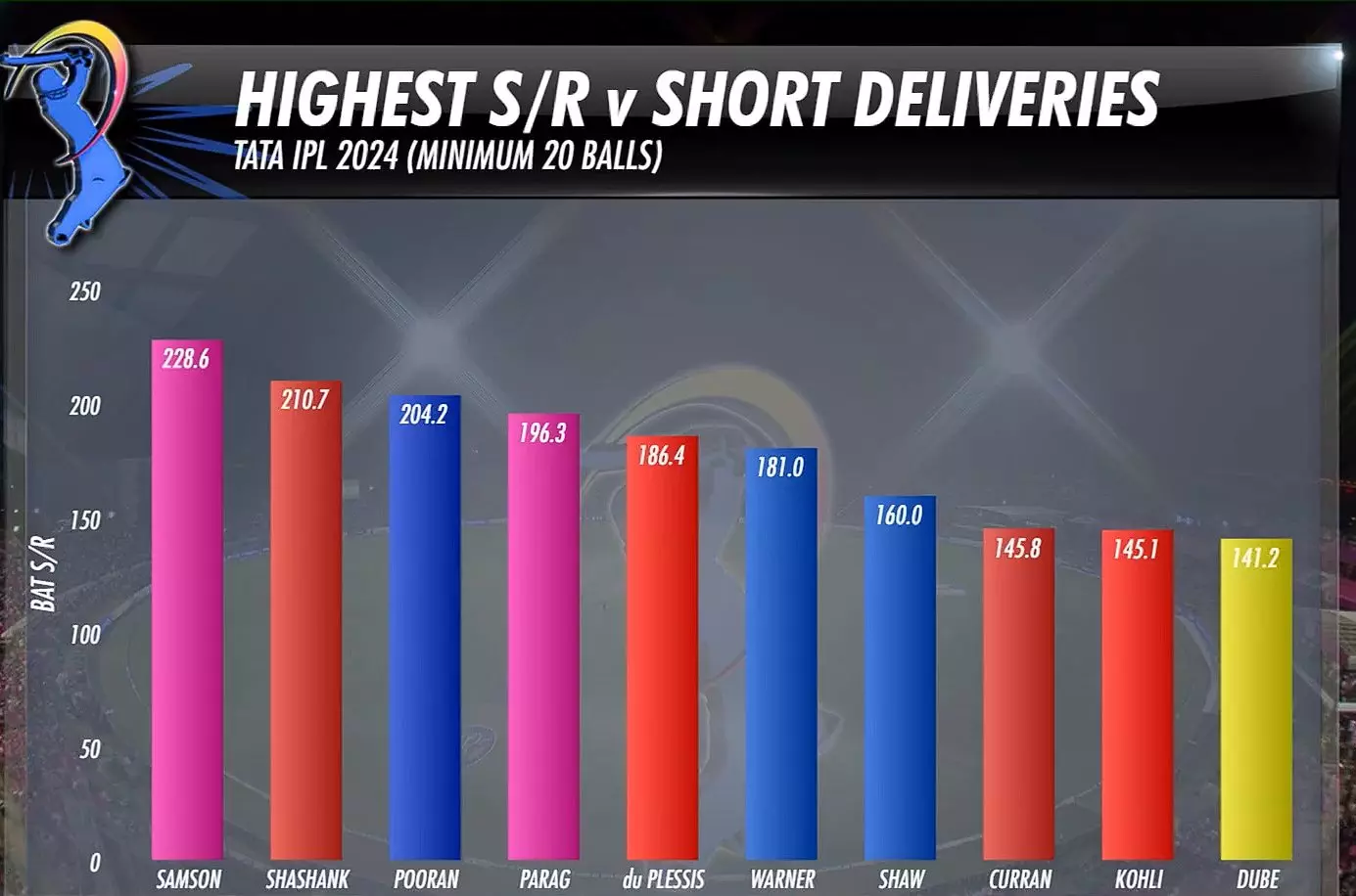 എന്നാൽ അങ്ങനെ ഷോർട്ട് പിച്ച് പന്തുകൾ കളിക്കാനാകാത്ത ആളൊന്നുമല്ല സഞ്ജു. പോയ ഐപിഎല്ലിൽ ഷോർട്ട് പിച്ച് പന്തുകളിൽ മികച്ച സ്ട്രൈക്ക് റേറ്റുള്ളവരുടെ സ്റ്റാറ്റ്സ് ആണിത്. ഈ ലിസ്റ്റിൽ ഒന്നാമതുള്ളത് ഇതേ സഞ്ജുവാണ്.