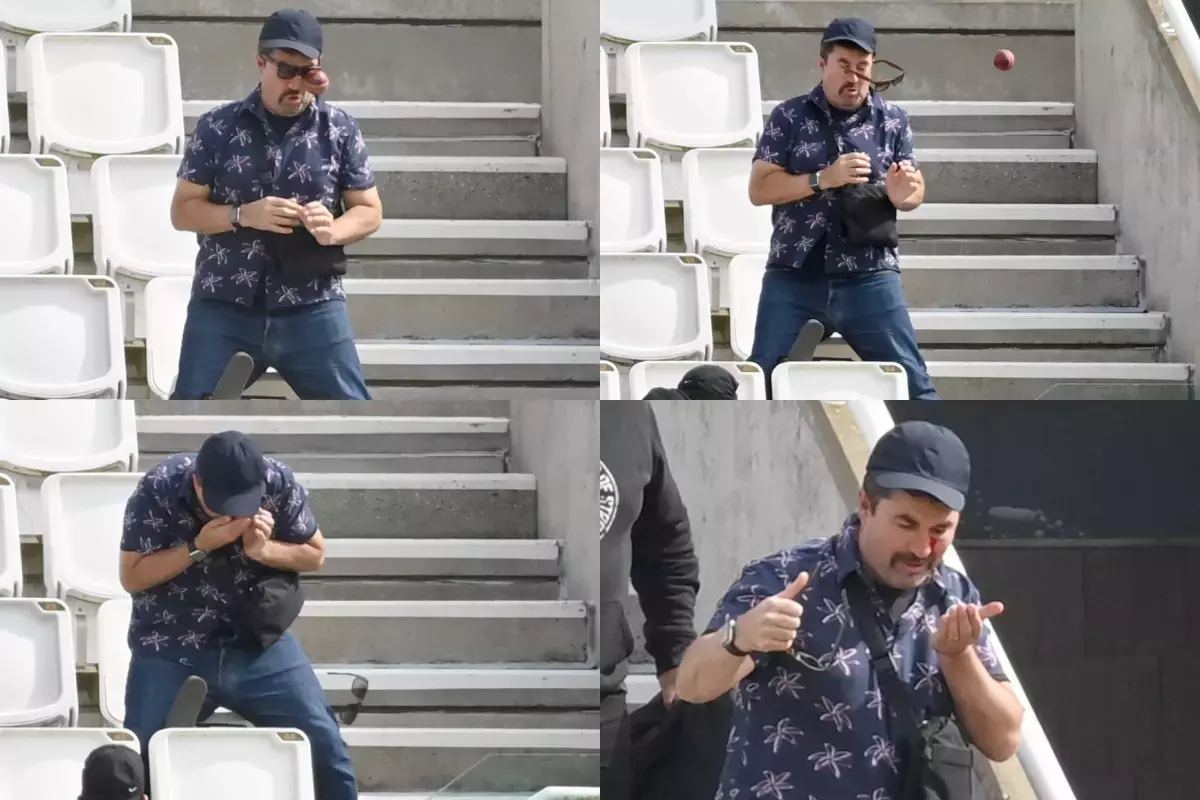 രവീന്ദ്ര ജഡേജ എറിഞ്ഞ100ാം ഓവറിലെ ആദ്യ പന്തായിരുന്നു ഡീപ് മിഡ് വിക്കറ്റിന് മുകളിലൂടെ സൗത്തി സിക്സര് പറത്തിയത്. എന്നാൽ പന്ത് പിടിക്കാനുള്ള ആരാധകന്റെ ശ്രമം പാളിയപ്പോൾ പന്ത് കൊണ്ടത് മുഖത്തും. ചോരയൊലിച്ച് നിൽക്കുന്ന ഇയാളുടെ ചിത്രം ടിവി സ്ക്രീനിലും കാണിച്ചു. പിന്നാലെ സമൂഹമാധ്യമങ്ങളിലും വ്യാപകമായി പ്രചരിച്ചു.