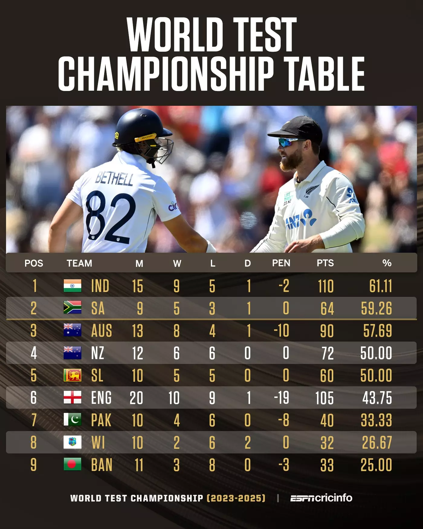 നിലവിൽ 15 മത്സരങ്ങളിൽ നിന്നായി ഒമ്പത് വിജയവും അഞ്ച് തോൽവിയും ഒരു സമനിലയും ഉൾപ്പെടെ 61.11 വിജയശതമാനമാണ് ഇന്ത്യയ്ക്കുള്ളത്. 9 മത്സരങ്ങളിൽ നിന്നായി 5 ജയവും മൂന്ന് തോൽവിയും ഒരു സമനിലയുമടക്കം 59.26 പോയന്റുമായി ദക്ഷിണാഫ്രിക്കയാണ് തൊട്ടുപിന്നിൽ. 57.69 പോയന്റുമായി ആസ്ത്രേലിയ മൂന്നാമതും 50 പോയന്റുമായി ന്യൂസിലാൻഡ് നാലാമതും നിൽക്കുന്നു. ബോർഡർ-ഗവാസ്കർ ട്രോഫിയിൽ 5-0, 4-0, 4-1, 3-0 എന്നിങ്ങനെ പരമ്പര സ്വന്തമാക്കാനായാൽ മറ്റ് ടീമുകളുടെ ഫലങ്ങളെ ആശ്രയിക്കാതെ ലോക ടെസ്റ്റ് ചാംപ്യൻഷിപ്പ് ഫൈനലിലേക്കുള്ള പടി രോഹിത് ശർമക്കും സംഘത്തിനും ചവിട്ടികയറാനാകും. നേരത്തെ ബോർഡർ-ഗവാസ്കർ ട്രോഫിയിൽ 4-0 സ്വന്തമാക്കിയാൽ മാത്രമായിരുന്നു ഇന്ത്യക്ക് സാധ്യത കൽപിച്ചിരുന്നത്.